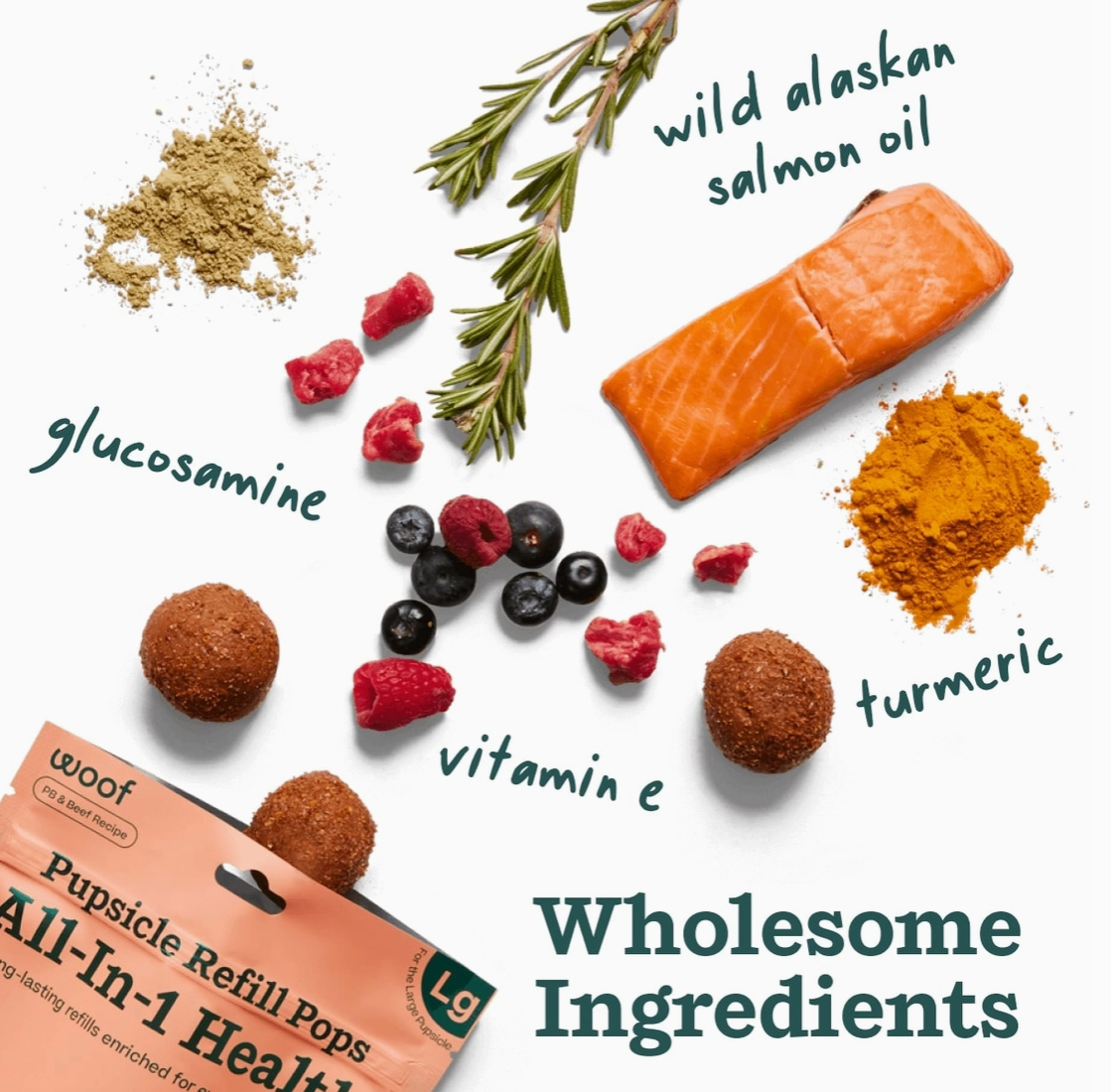 Our All-in-1 Wellness Pops provide 20 to 40 minutes of play, with the added benefit of 16 powerhouse ingredients for your pup’s overall health.  Made in small batches in the USA with all-natural ingredients, pups of all shapes, sizes and ages love our Pops. They're long-lasting, mess-free, and conveniently shelf stable (no refrigeration needed).