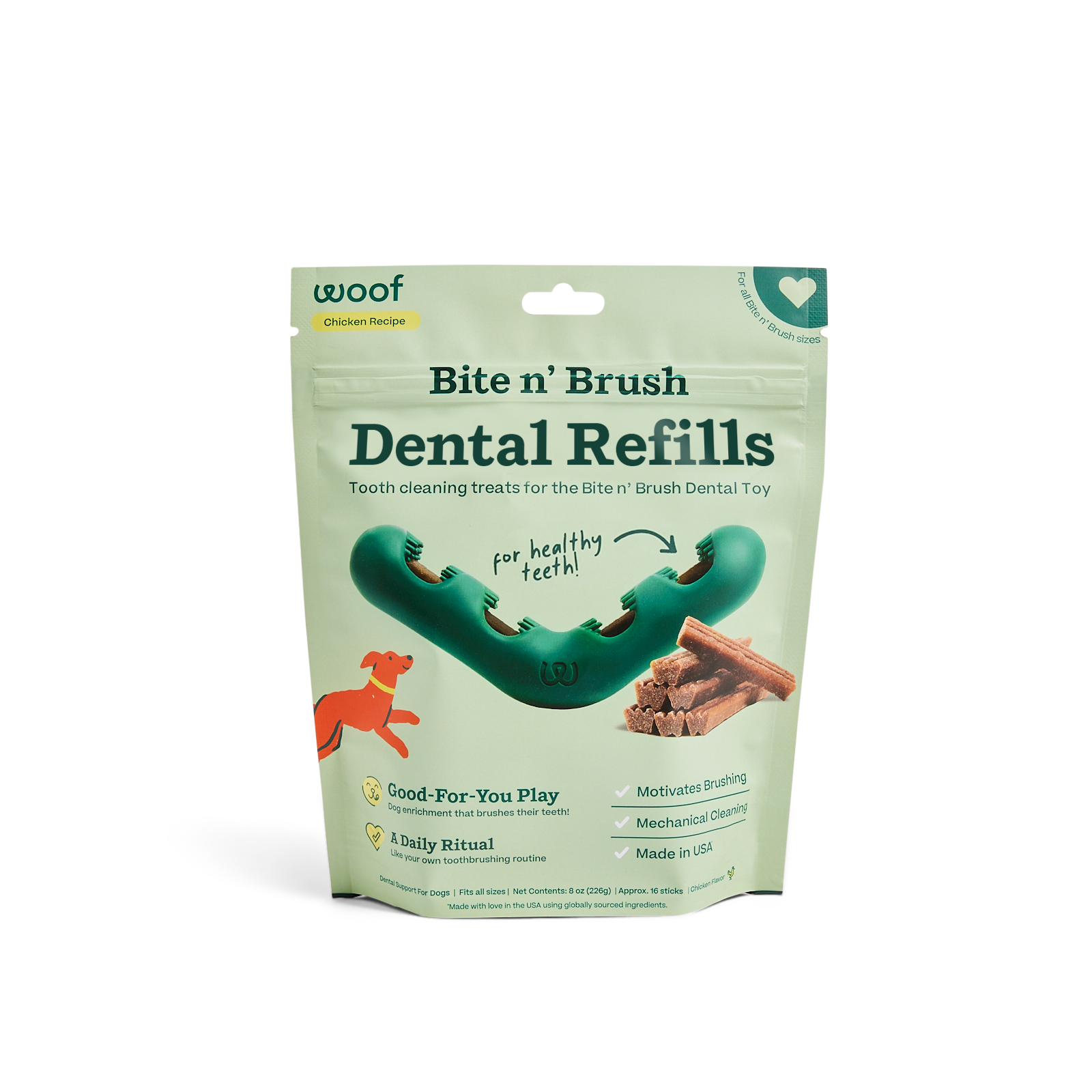 You brush your teeth—now your dog can brush theirs! Bite n’ Brush Refills give your dog cleaner teeth with every bite. Our Refills for the Bite n' Brush are small-batch made in the USA with all-natural, scientifically-backed ingredients including peppermint, kelp, parsley, and green tea to help support cleaner teeth. Pair with the Bite n’ Brush to extend the length of the treat, allowing the active ingredients even more time to work. The v-shaped design cleans all sides of the teeth and mouth, letting your dog scrub plaque and tartar off themselves!  Our Bite n’ Brush Refill treats are 'one size fits all' and work with both sizes of the Bite n' Brush.