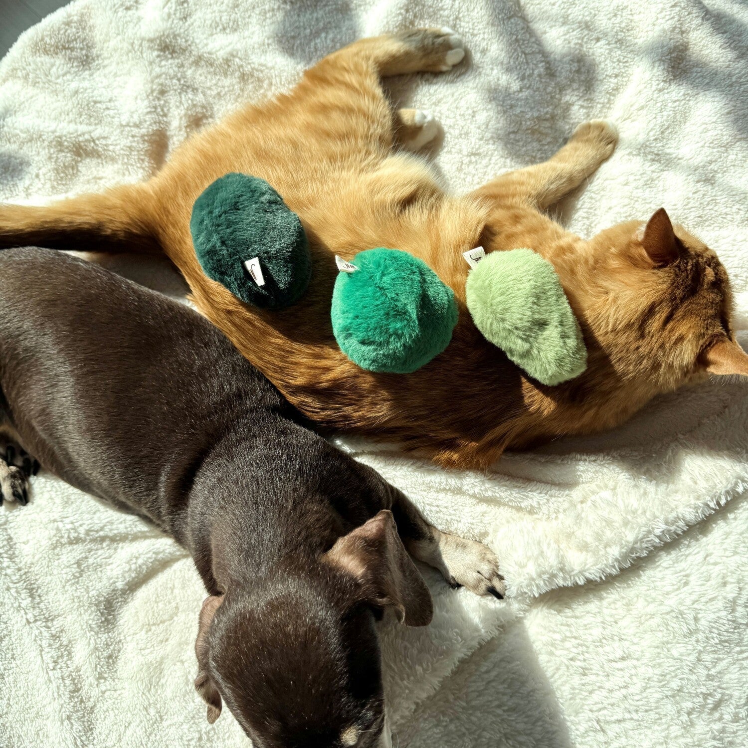A soft, plush set of three moss-inspired toys, filled with aromatic organic catnip.