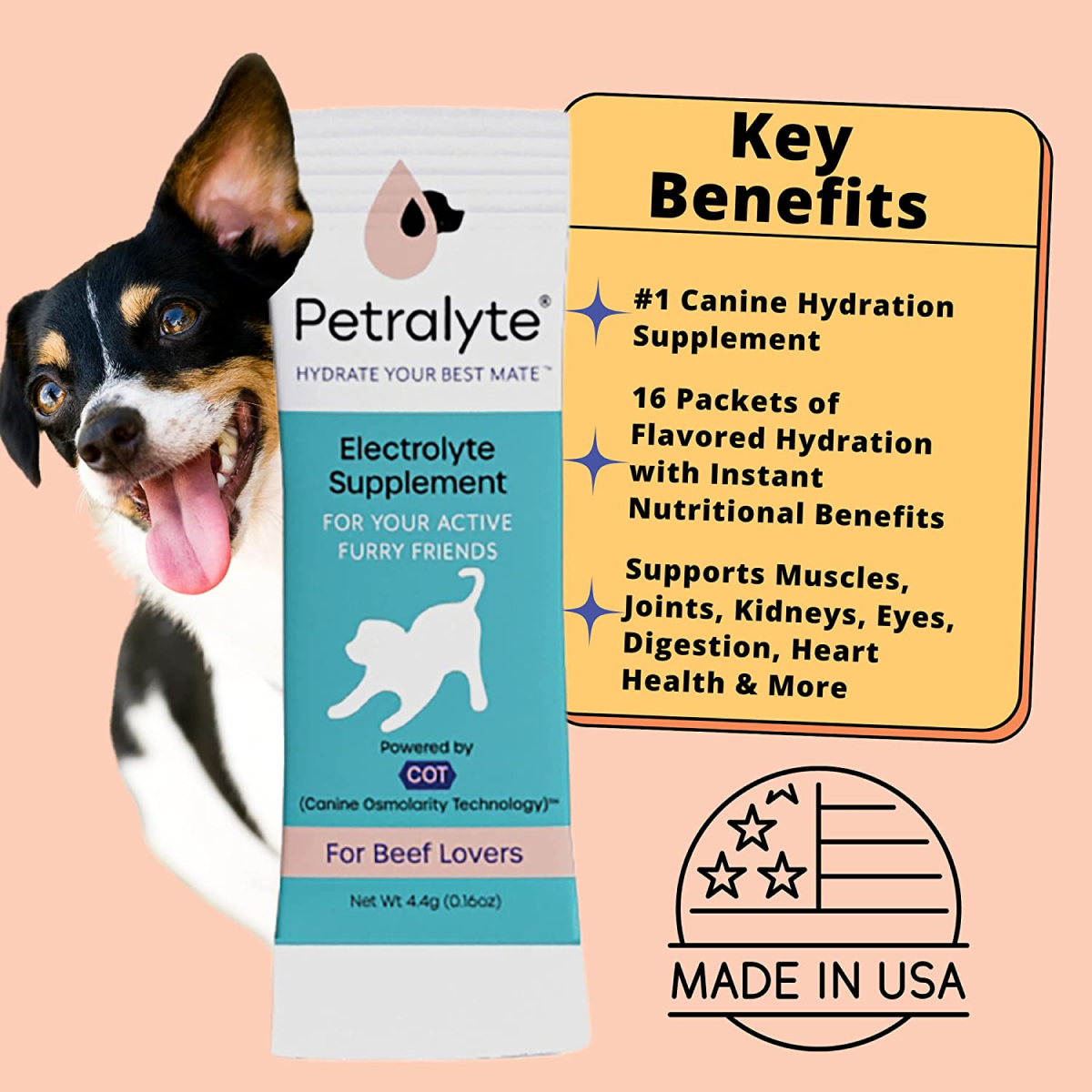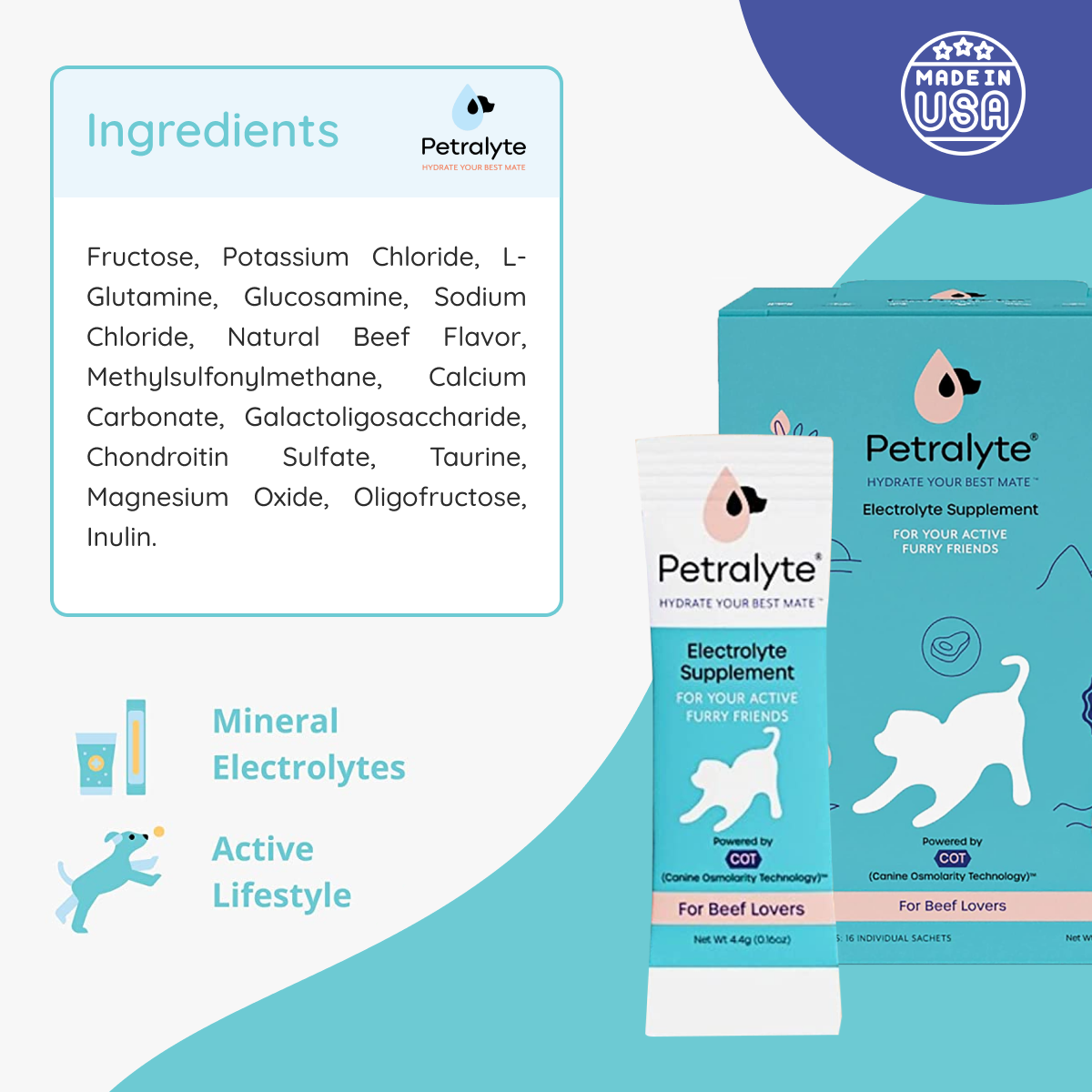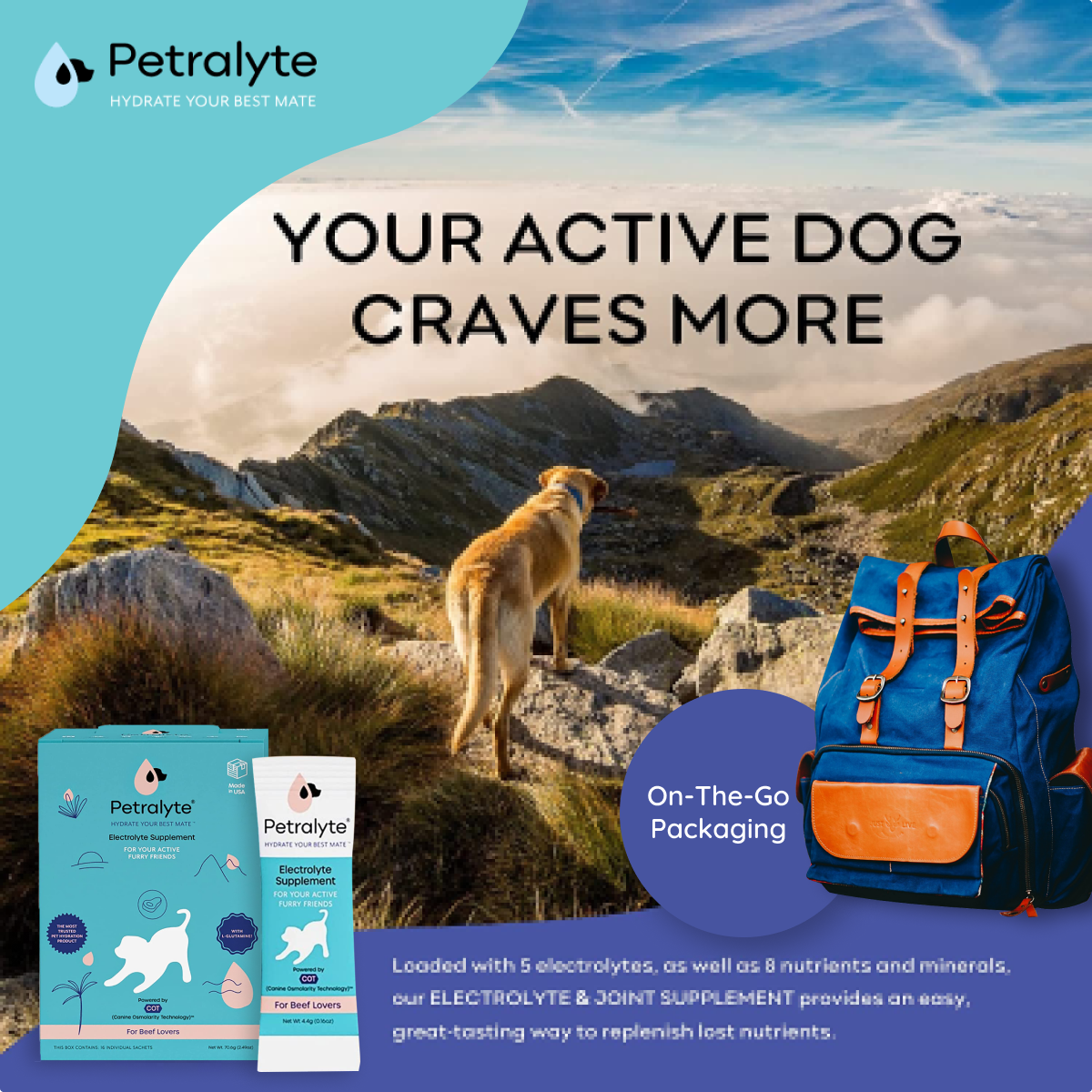 8-in-1 Formula & the #1 Dog Electrolyte and Joint Supplement. Dehydration related to heat stress is one of the most common preventable causes of death in dogs. Petralyte Dog Electrolyte and Joint Supplement is made with premium, natural ingredients that support physical performance and recovery for dogs of all ages, breeds, and sizes. Petralyte drastically improves the speed and efficiency of water absorption, helping dogs to stay hydrated and healthy. Canines need electrolytes and nutrients just like humans do, especially before, during, and after exercise, on hot weather days, and when recovering from illness. Supplements include Glucosamine, Chondroitin, and MSM for Mobility & Joints, Taurine for Muscle, Heart, & Vision, plus L-Glutamine, Galactooligosaccharides, Oligofructose, and Inulin for Intestines & Gut. Simply add Petralyte to wet / dry food OR 8oz of water and mix thoroughly for your pup to receive instant benefits.
