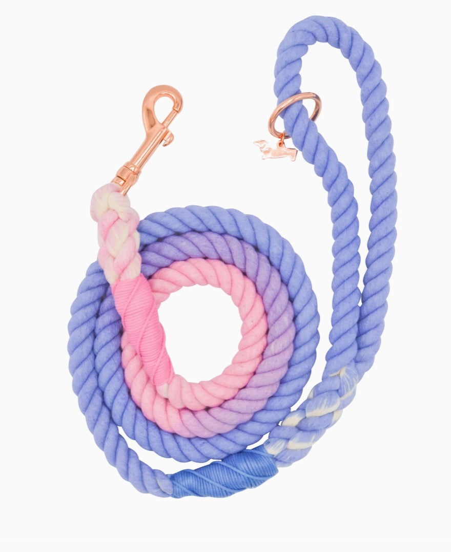 Beautiful colored rope will be sure to add a pop of color to any dog’s wardrobe! Made with strong, 100% cotton rope and natural dye. The rope is hand-spliced and ends are whipped to add strength and durability. Finished with beautiful rose gold hardware with a rose gold dog charm and accessory ring.