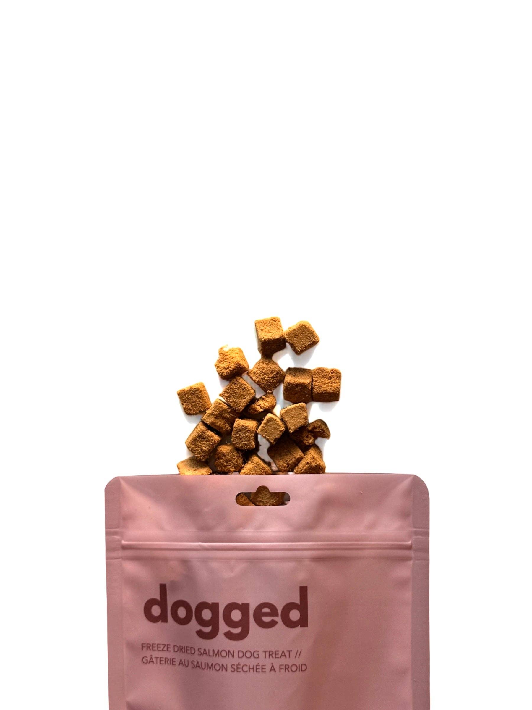 About this product * Single ingredient treat: 100% freeze dried salmon * Healthy treat: rich in Omega 3 fats (EPA+DHA), vitamin D, and Vitamin C * Freeze drying helps preserves quality nutrients vs baking or cooking * Made in Canada * Humanely raised and ethically sourced salmon * 75g bag Guaranteed Analysis Crude Protein 50% min Crude Fat 20% min Crude Fiber 2% max Moisture 6% max