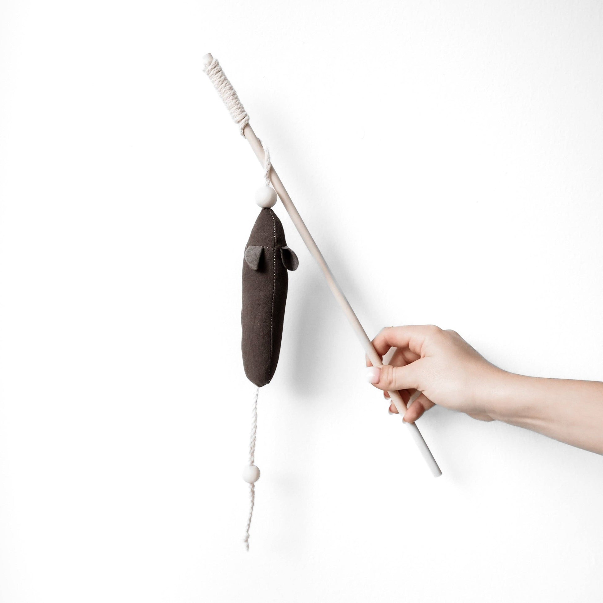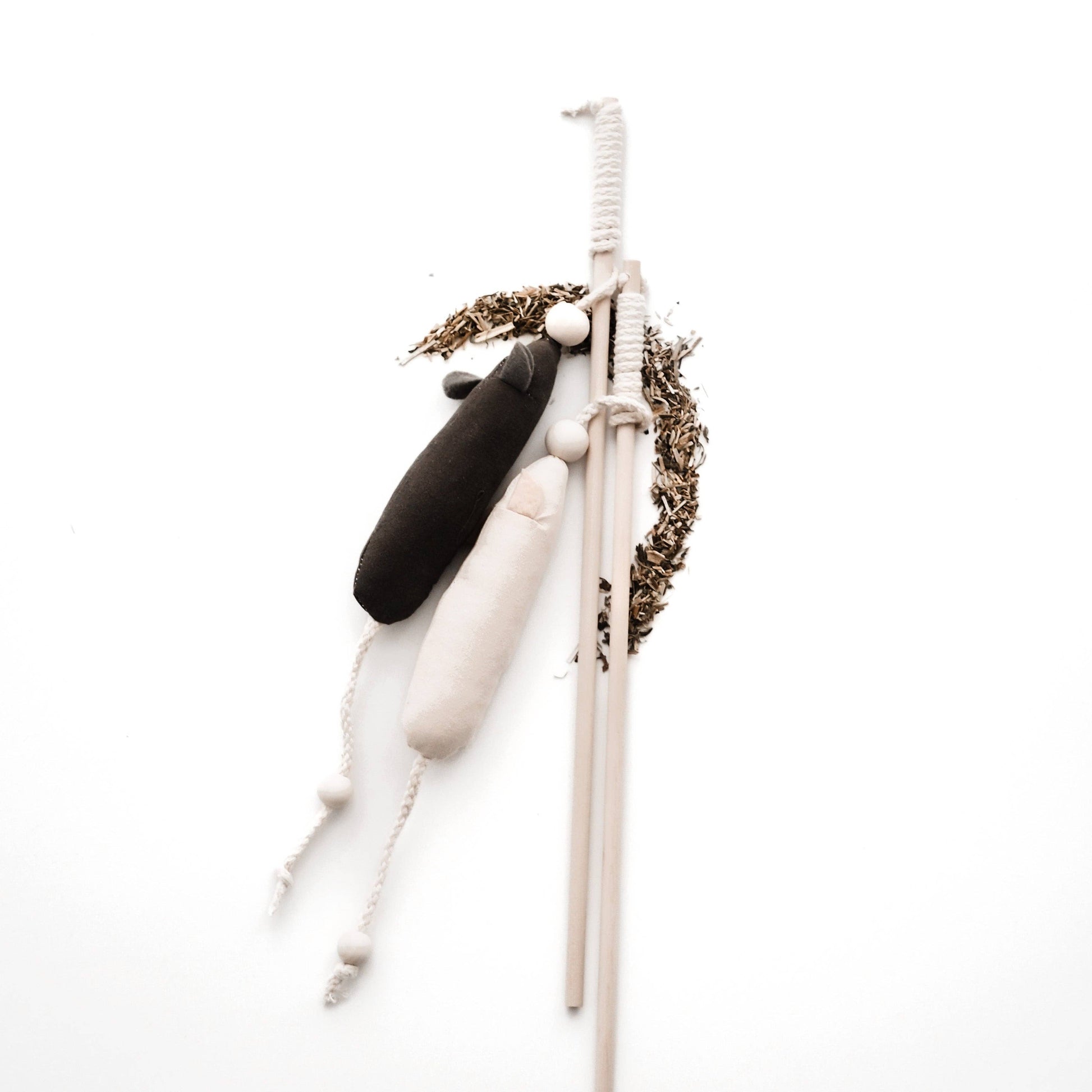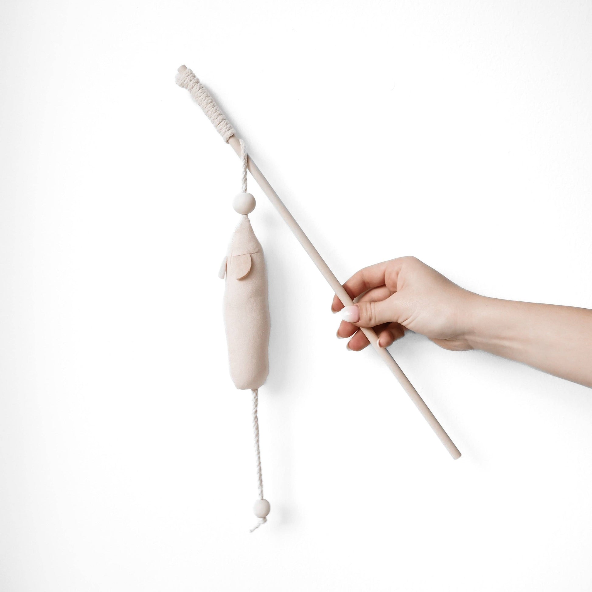 High-quality fishing rod for your cat! Playing is part of a cat's nature, is extremely important for their well-being and strengthens the bond between you and your cat. The fishing rod from “Minty & Marla - Alles für dich und deine Katze®” offers lots of fun and excitement for your cat with a linen pendant filled with catnip. In addition, the small wooden balls on the fishing rod make your cat more interested, as they make noises when pulled across the ground. * handmade * stimulates the game * real wooden rod * Canvas mouse * extra long cotton rope * with natural catnip Length of wooden handle: 40cm Length of rope: 80 cm Longer mouse: 15cm