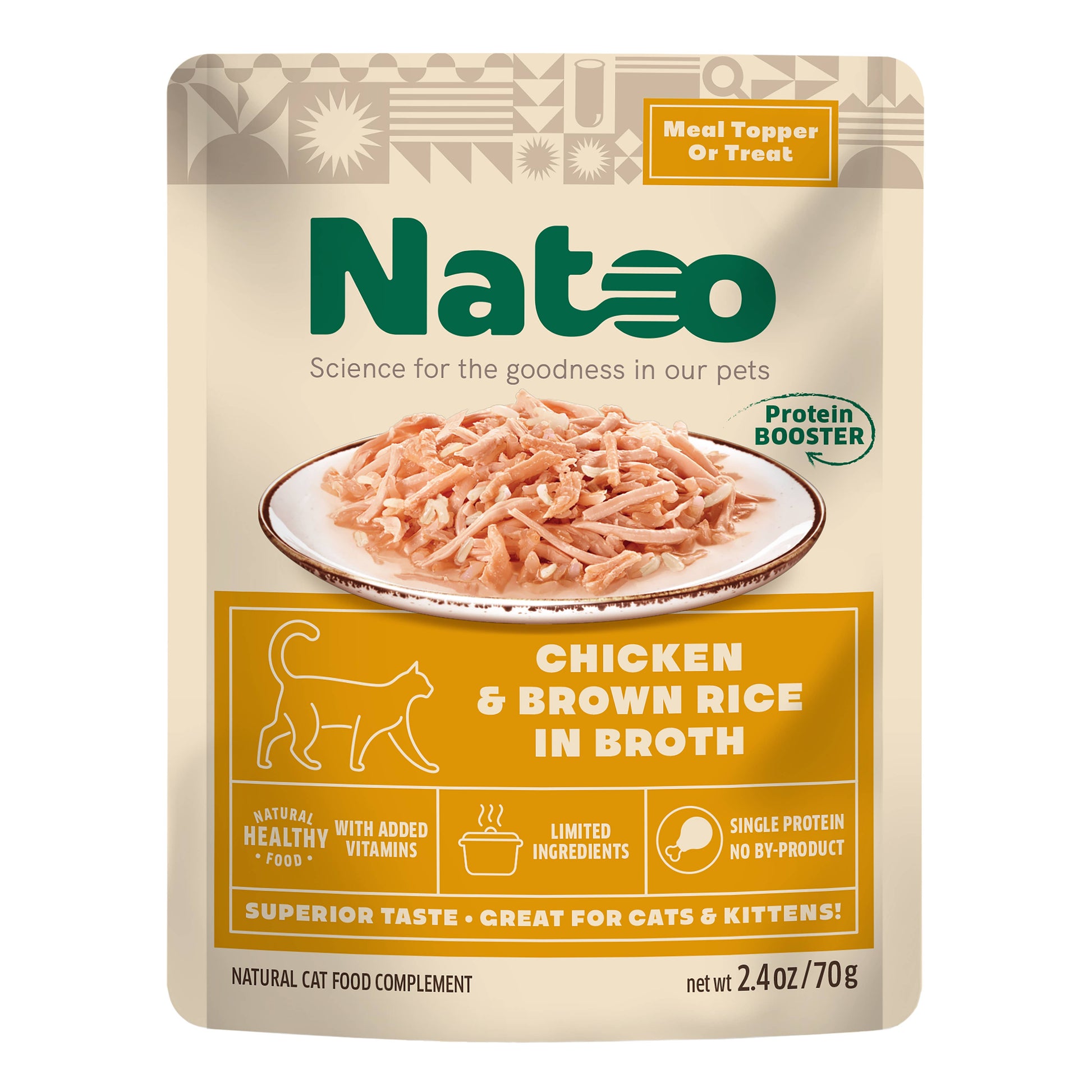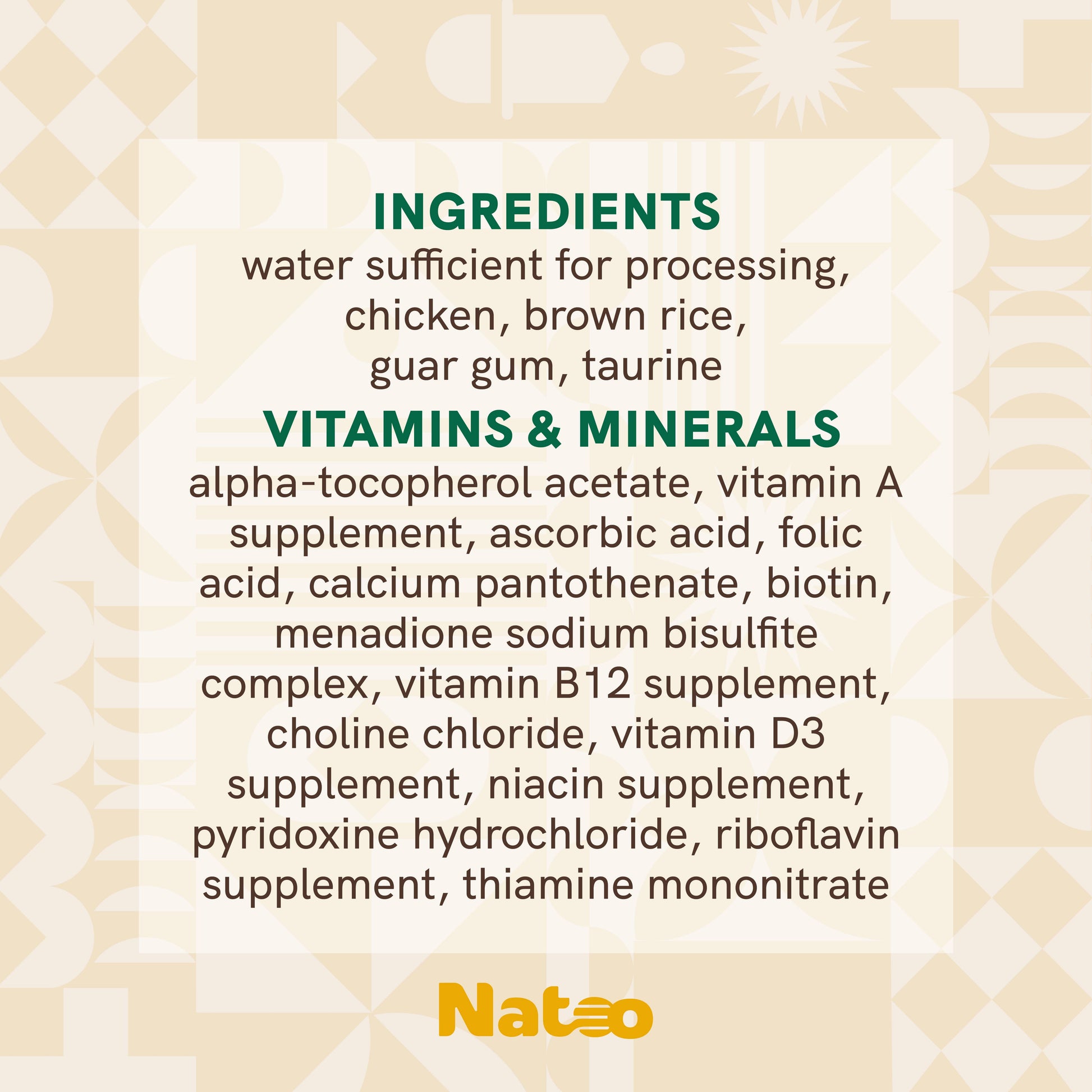 Natoo Chicken & Brown Rice in Broth is formulated with clean, healthy ingredients cats naturally crave. Perfect for cats of every size and age, this vitamin-fortified recipe features broth with an irresistible flavor. Made with high quality chicken, it’s rich in protein and contains few calories. Plus, it does not contain any by-products, preservatives, artificial colors or flavors. This product should be served as a meal topper or a treat and is intended for intermittent or supplemental feeding only. Our food scientists partner with veterinarians and researchers to ensure each bite has the optimal nutrition your pet needs to thrive.