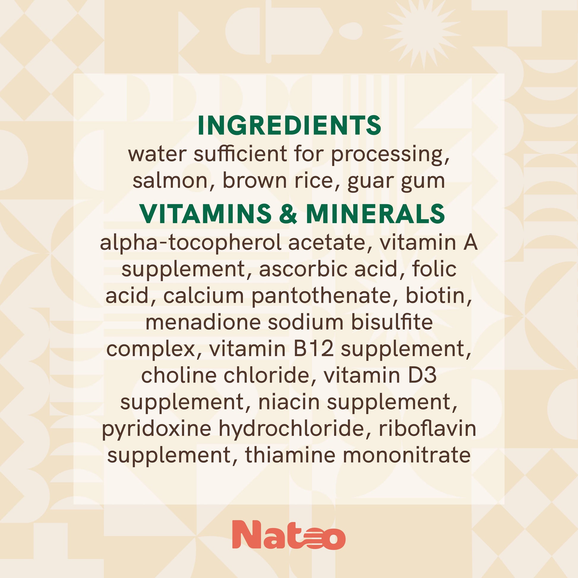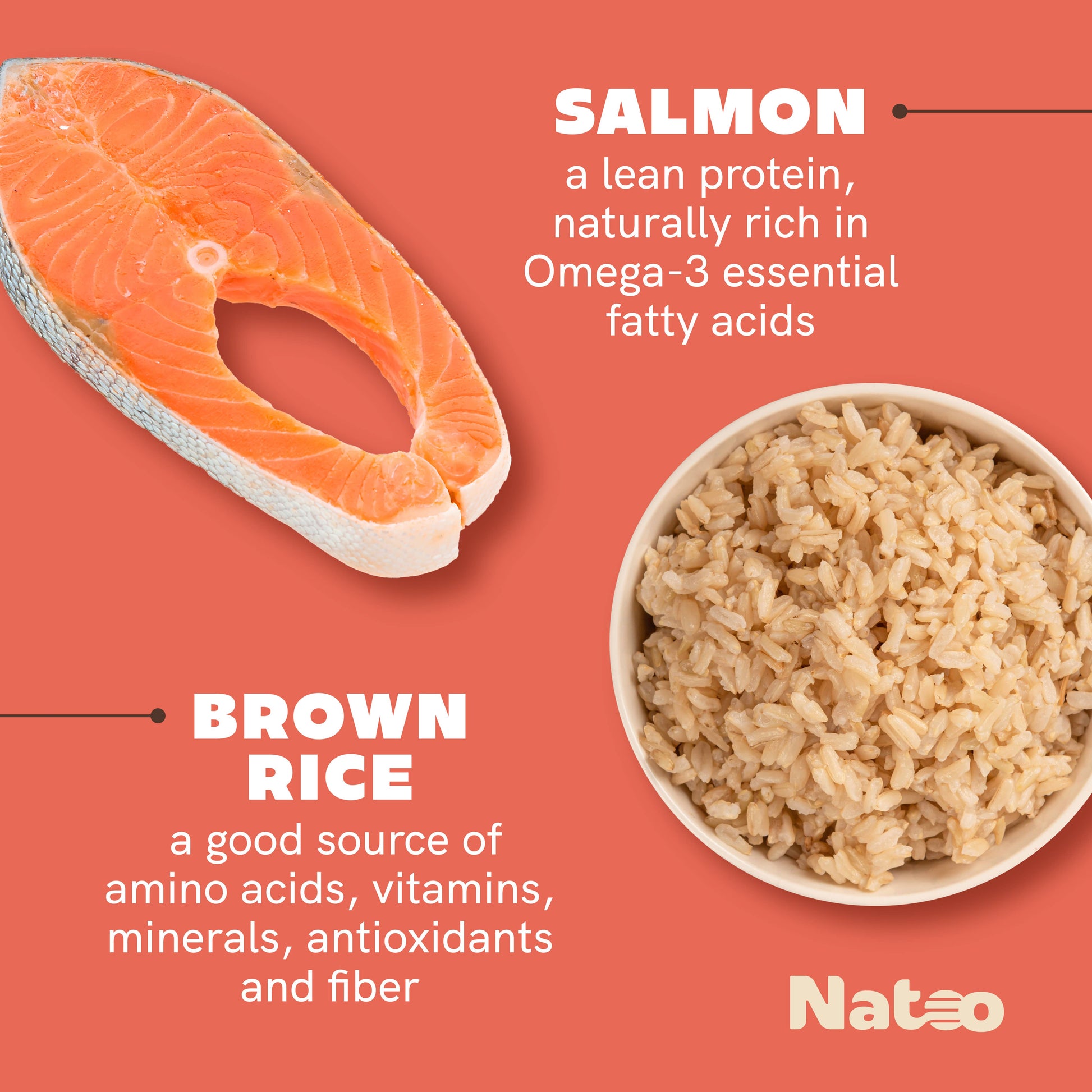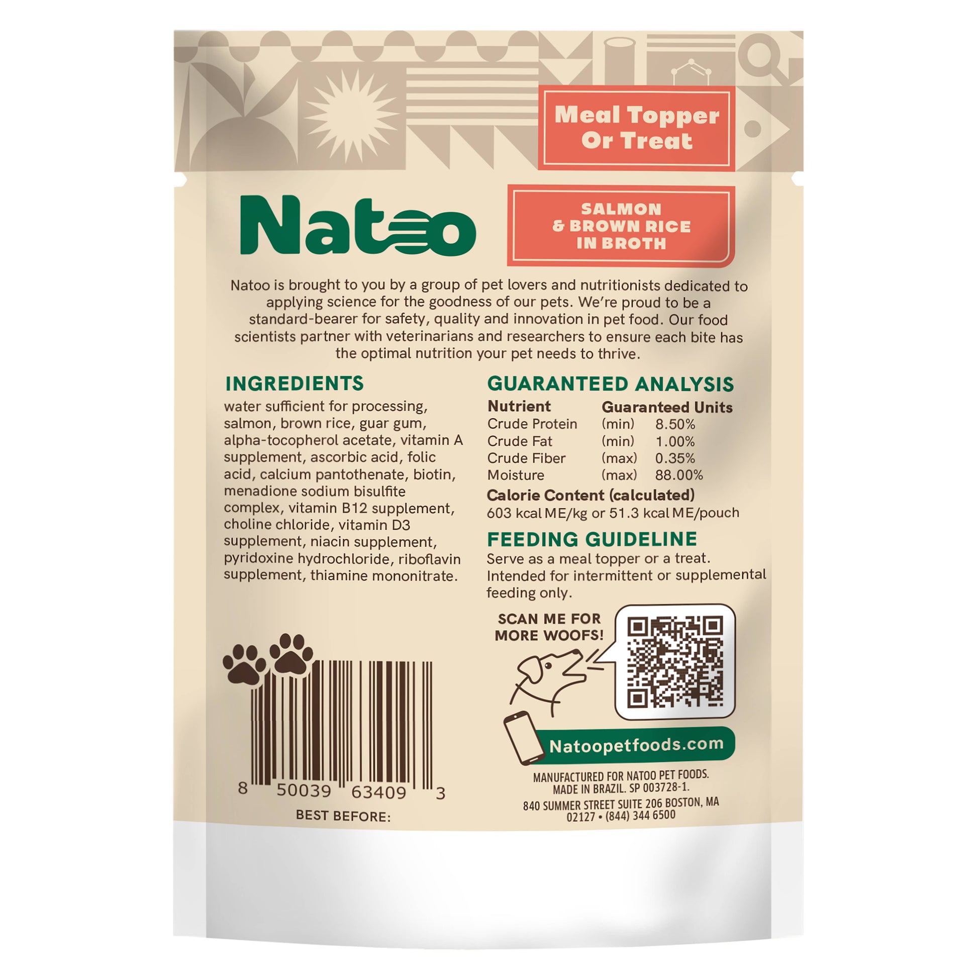 Natoo Salmon & Brown Rice in Broth is formulated with clean, healthy ingredients dogs naturally crave. Perfect for dogs of every size and age, this vitamin-fortified recipe features broth with an irresistible flavor. Made with limited ingredients, it does not contain any by-products, preservatives, artificial colors or flavors. This product should be served as a meal topper or a treat and is intended for intermittent or supplemental feeding only. Our food scientists partner with veterinarians and researchers to ensure each bite has the optimal nutrition your pet needs to thrive.