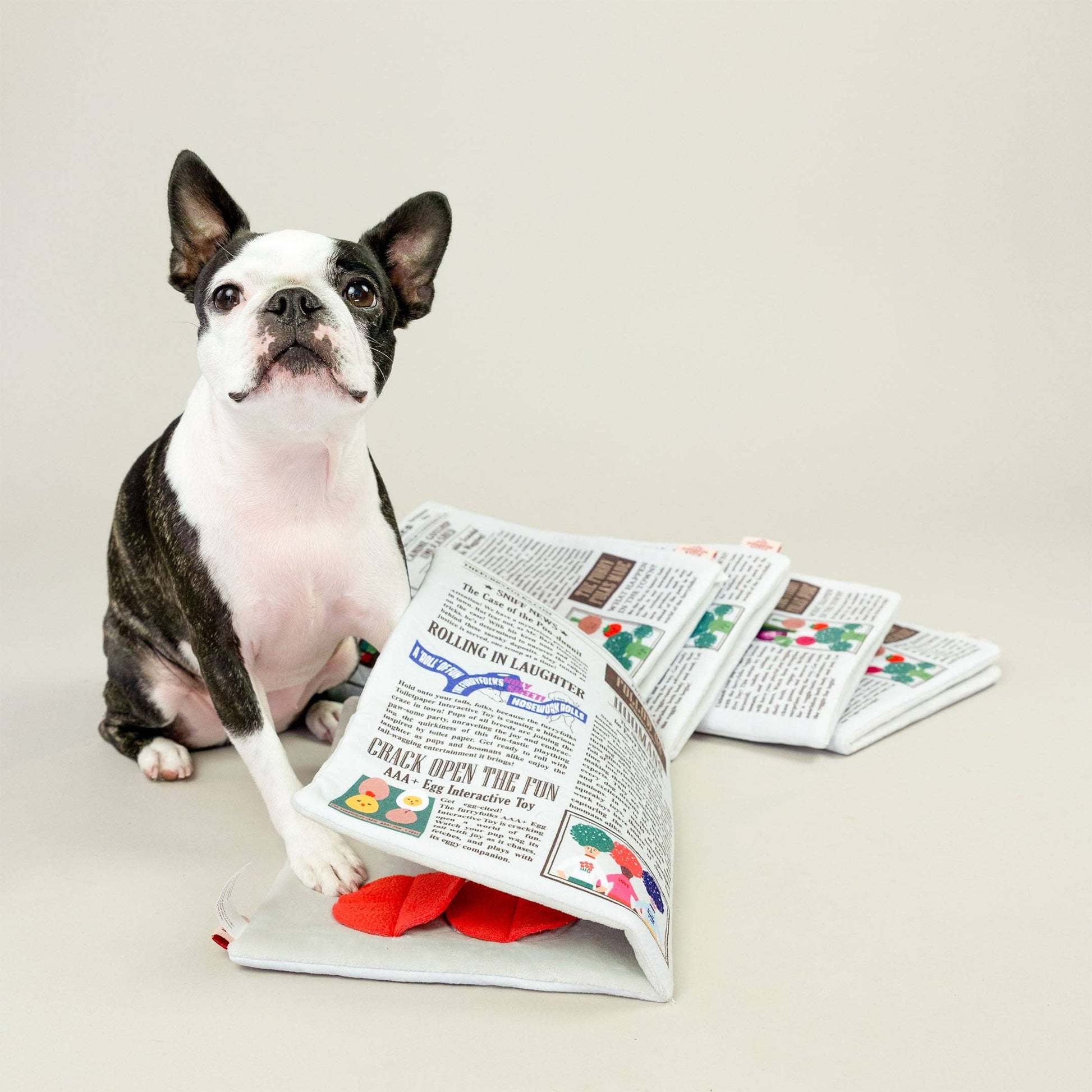 the furryfolks delivers headlining joy to your doorstep! Want your furry friend to look like the smartest pup on the block while having a blast? Scoop up the Newspaper Nosework Toy! Packed with treat-hiding strips and secret pockets, this one-of-a-kind toy turns playtime into a thrilling treasure hunt. With crinkle paper and squeakers, it’s a recipe for endless fun and mental stimulation. The Newspaper Nosework toy is made with soft, non-irritating fabric. Polyester Sponge sheet Crinkle paper Squeaker Machine wash cold with mild detergent Tumble dry low or air-dry Do not use fabric softeners Do not bleach Do not iron Do not dry clean No toys are entirely indestructible. For the safety of your furry friends, please keep the furryfolks item(s) within reach of your eyes and check the product(s) 's condition daily. Please remove and replace the damaged item(s). When closed: 8.25 in x 11 in When opened: 16.5 in x 11 in All products are handmade, and sizes may vary slightly.