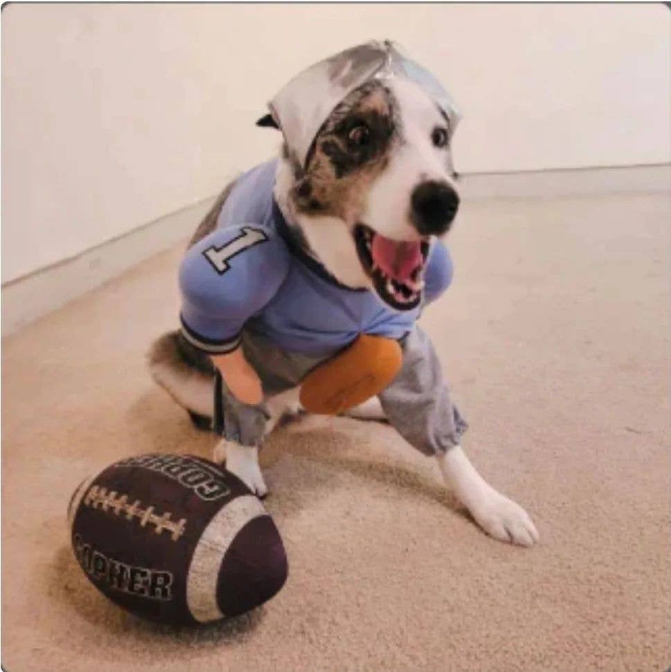 The QuarterBark is not your average foot-dawg outfit. Made of 100% polyester knitted fabric, this high-quality custom costume comes with an adorable football ready to touch down. This one is sure to be a wide receiver of tons of compliments! Available in a variety of sizes, this cozy and adorable outfit is a great go-to outfit for the park, a perfect gift, and a novelty that will last a life time!