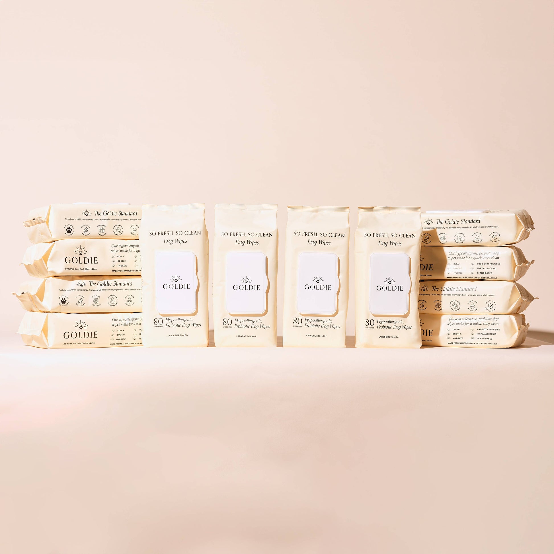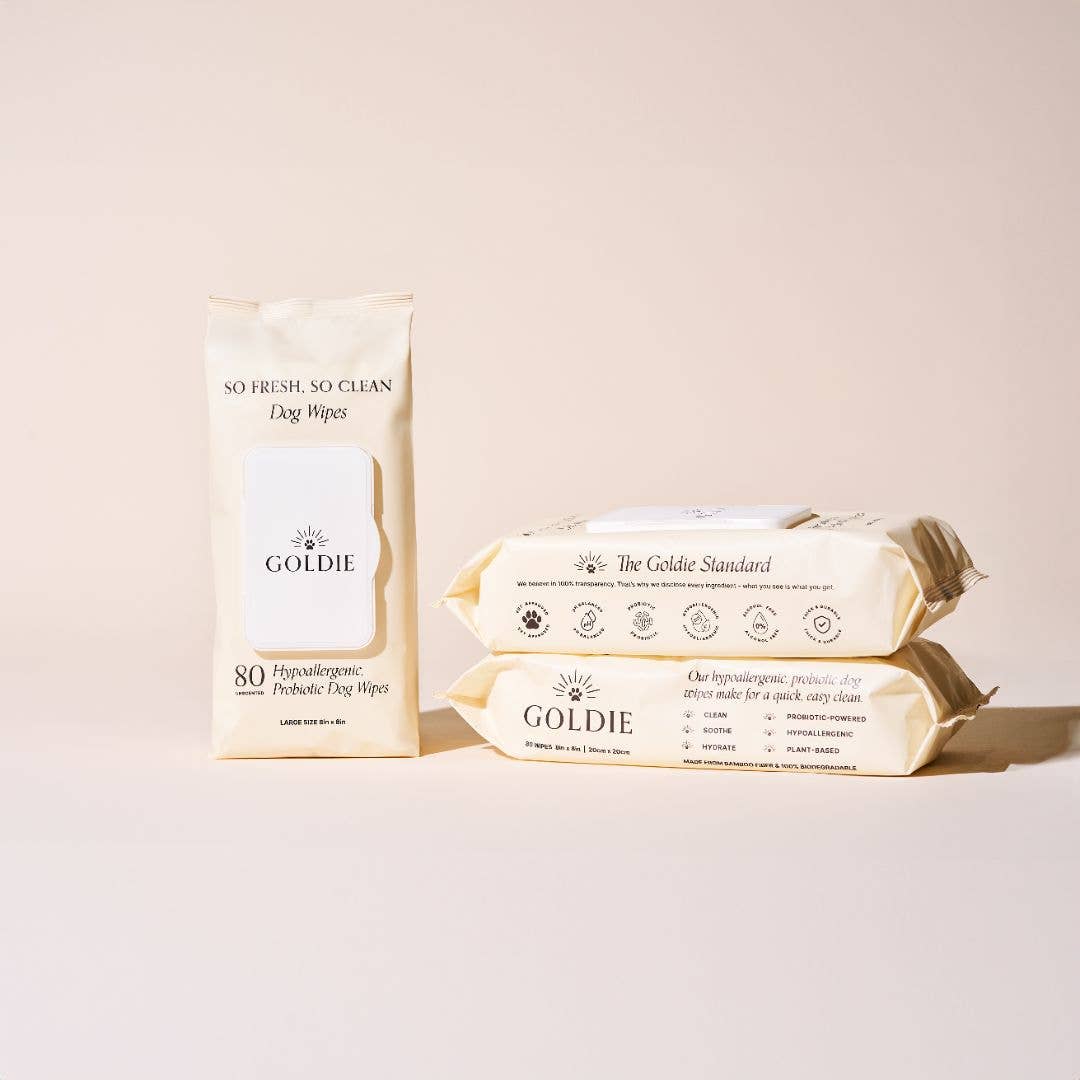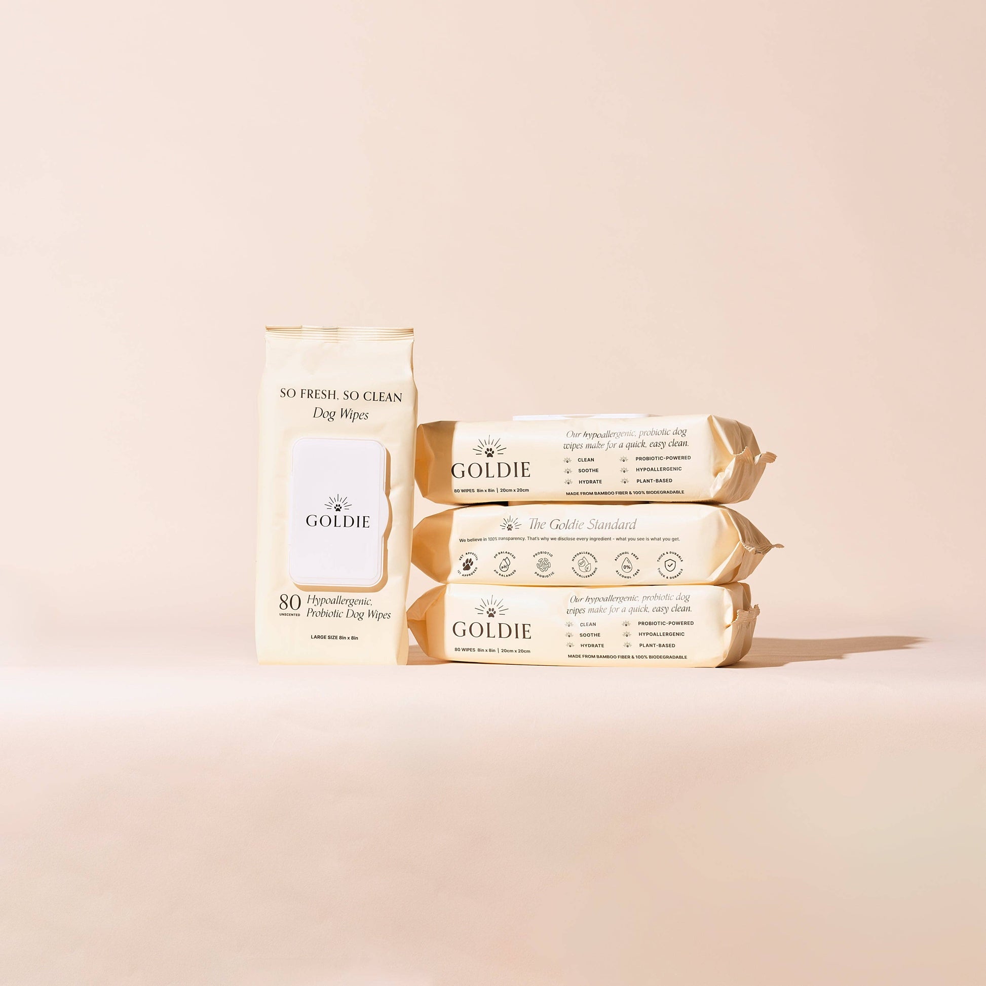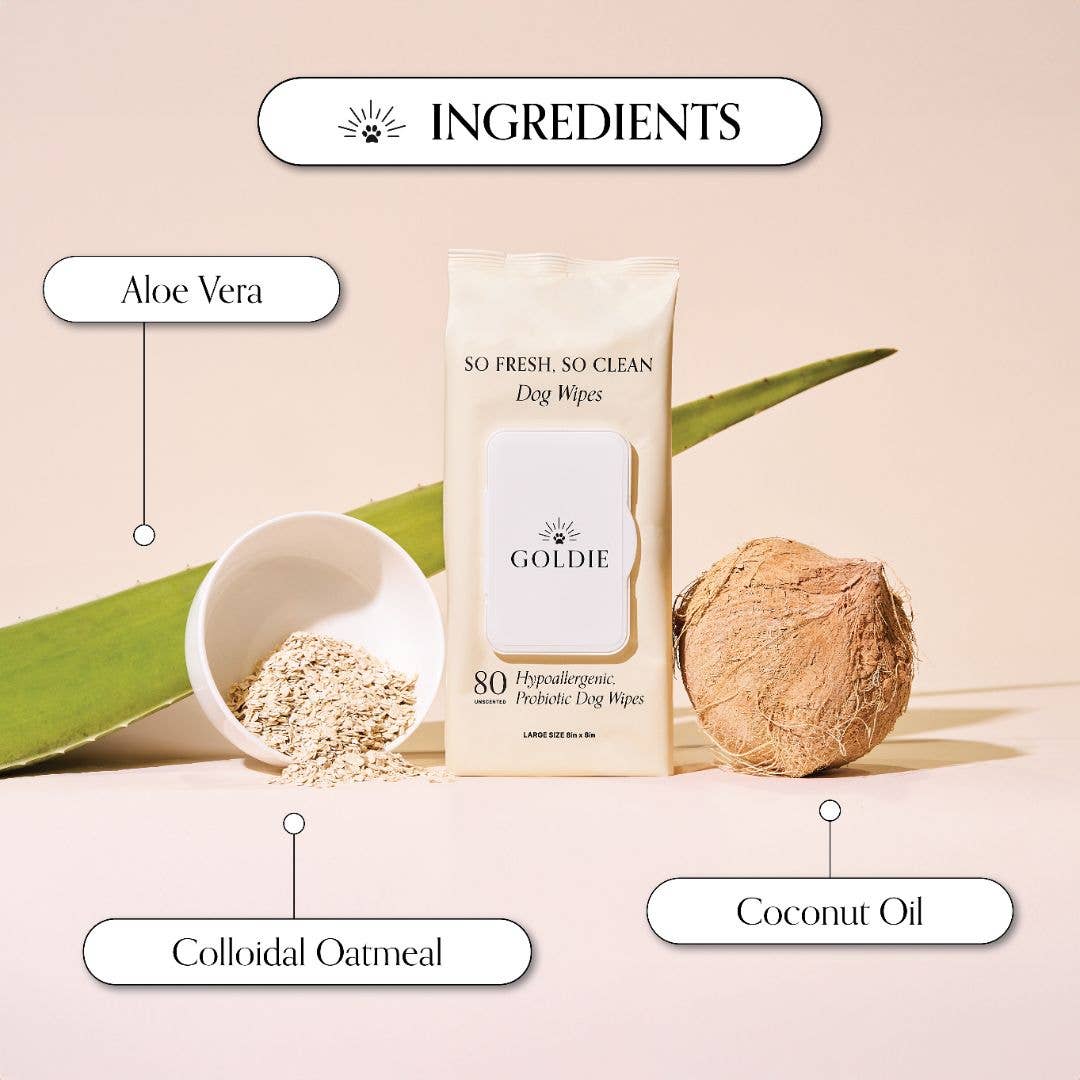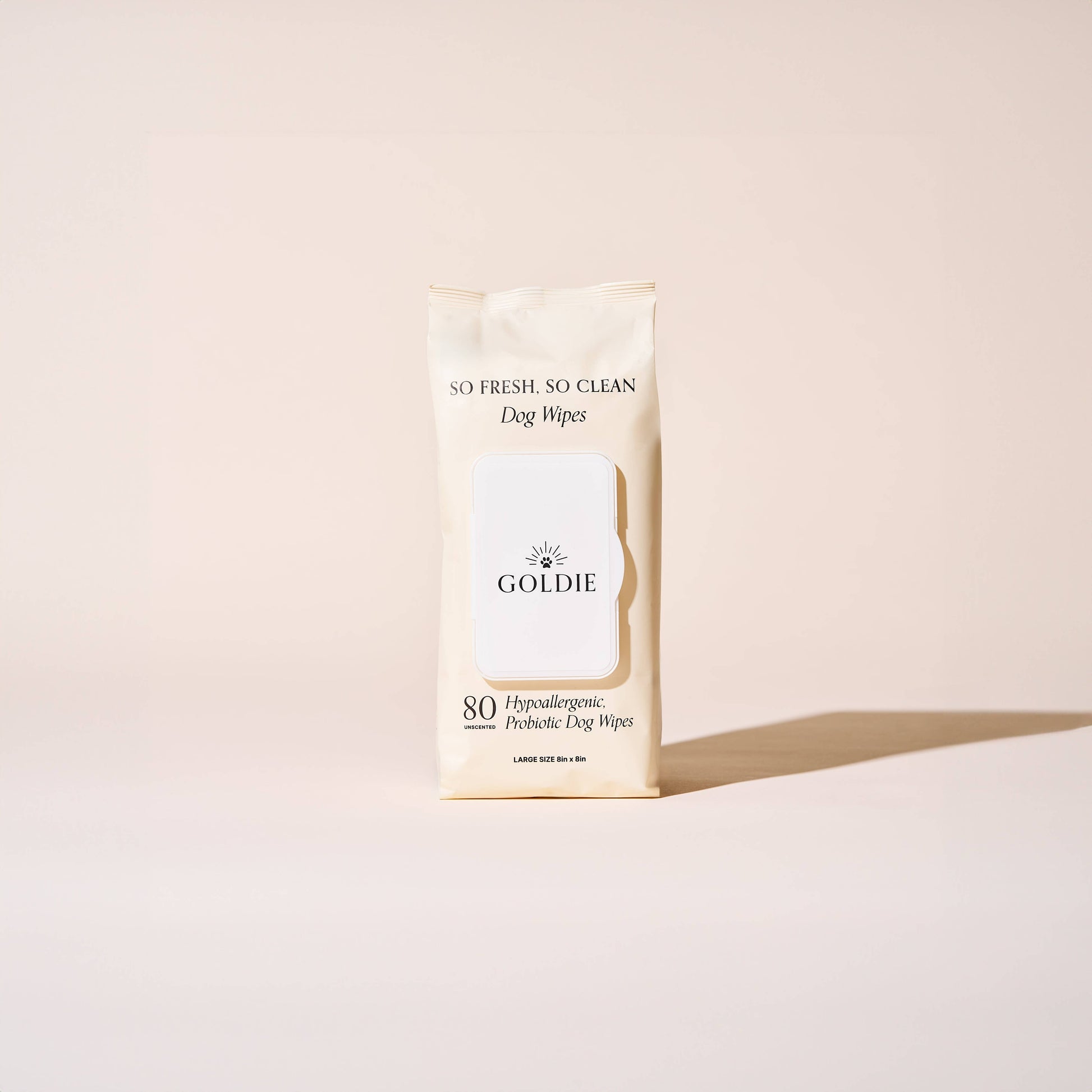 Give your dog a fresh, clean feel—without the bath! Our probiotic and hypoallergenic wipes gently remove dirt, allergens, and irritants while soothing itchy, sensitive skin. Designed for paws, coat, skin folds, and even sensitive areas, these wipes keep your dog clean and itch-free- and your home clean! Infused with skin-loving ingredients like probiotics, colloidal oatmeal, aloe, and coconut oil, these wipes balance your dog’s skin microbiome, reduce irritation, and promote a shiny, healthy coat. Perfect for at-home use, post-walk cleanups, or on-the-go freshness. Vet-Approved Formula, pH Balanced, hypoallergenic and made from bamboo and 100% recyclable. Key Ingredients- probiotics, aloe vera, colloidal oatmeal, niacinamide, jojoba oil, coconut oil, antioxidants, algae extract, and ginseng extract.