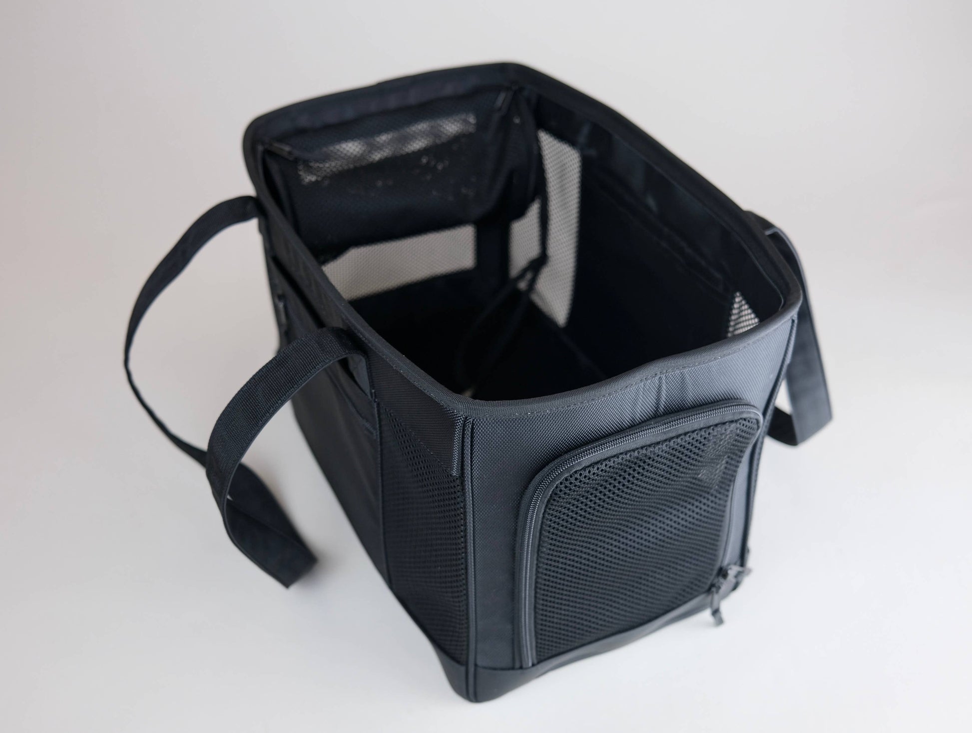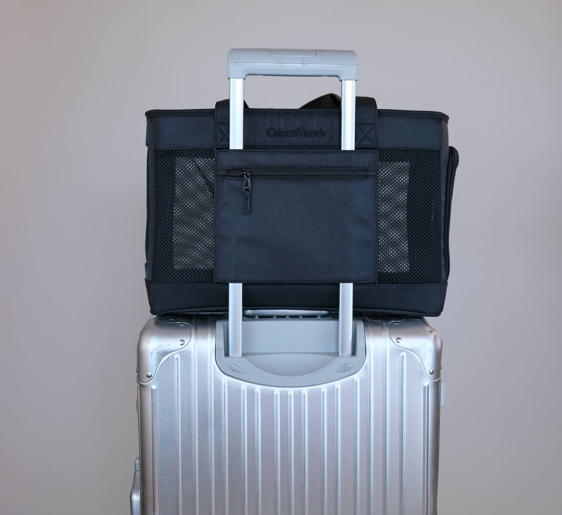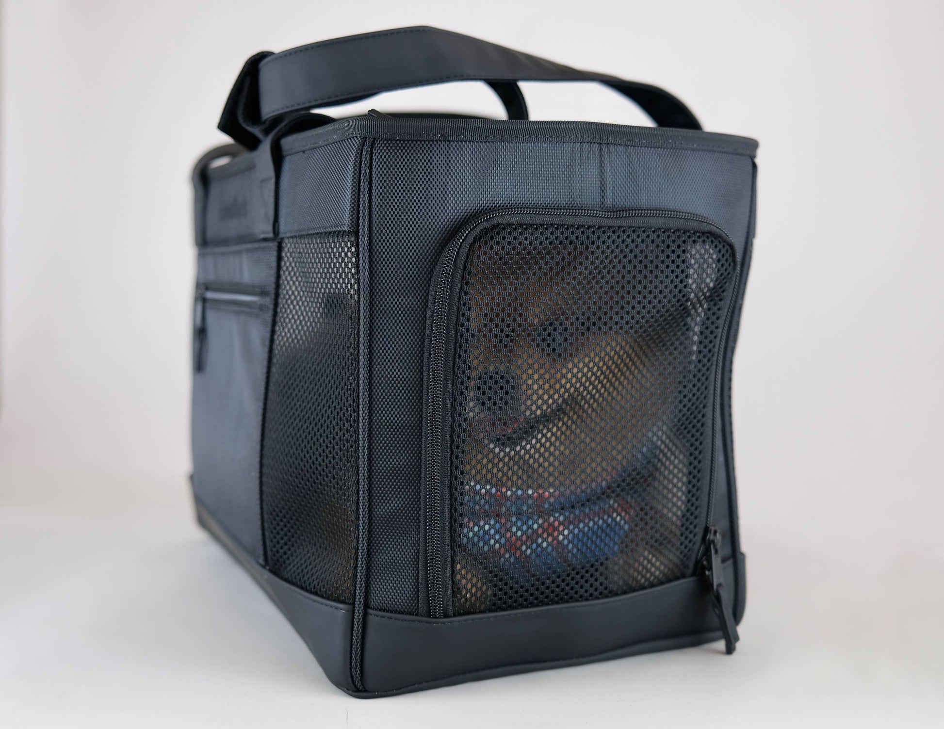 This travel dog carrier is designed to be a meeting point between an everyday pet carrier and a full-on air travel pet carrier. A deconstructed airline compliant carrier, with all the needed features and none of the cumbersome drawbacks found in most pet travel carriers. - It features a stiff base and frame which allows it to properly hold it’s shape. - Large mesh windows for maximum airflow and breathability - Luggage handle adapter that will accommodate most suitcases. - Fully secure with an adjustable safety tether. - Features multiple pockets for treats, poop bag, wallet, phone. - Material is a lightweight, water-resistant and durable quality Oxford fabric with resistant polyester breathable mesh and high-grade faux leather for the handles and base. - Dimensions (length x width x height) 16”L x 9”W x 10.5”H - Can carry up to 15lbs. - Also comes in Yellow. - Fits most small dogs, cats and rabbits. - Vegan and Cruelty-Free.