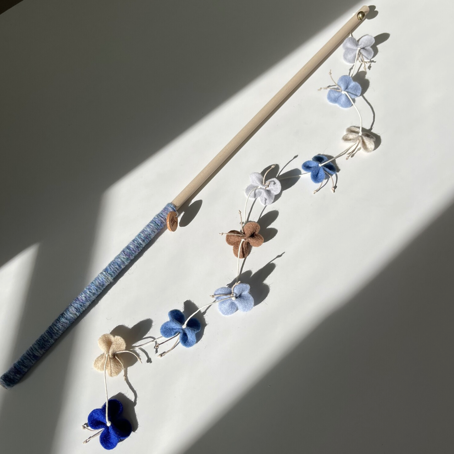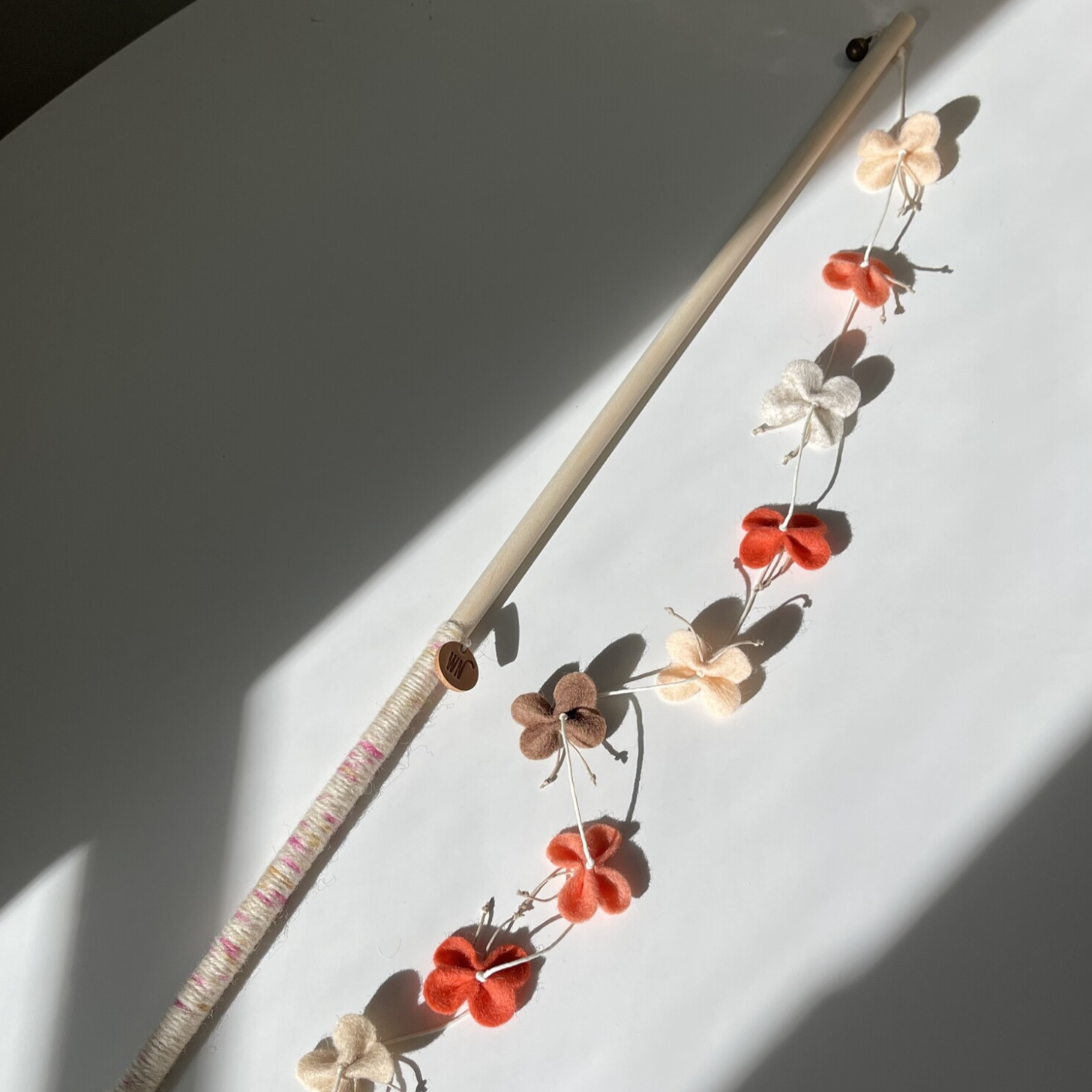 Wool felt, birch wood stick, bell, wool yarn, leather label
