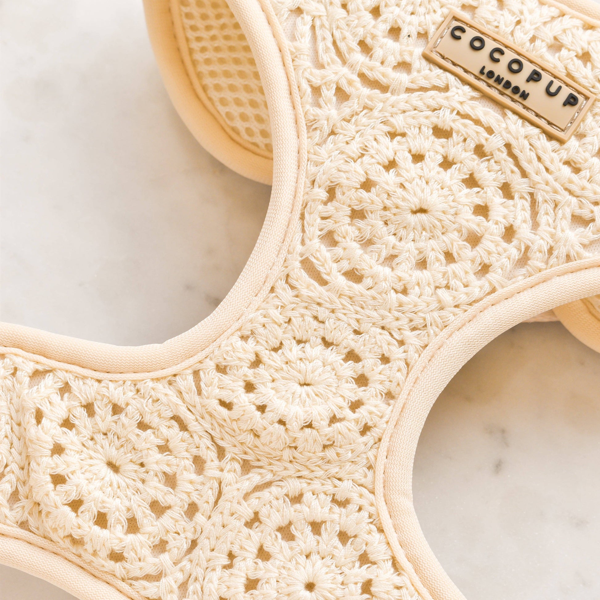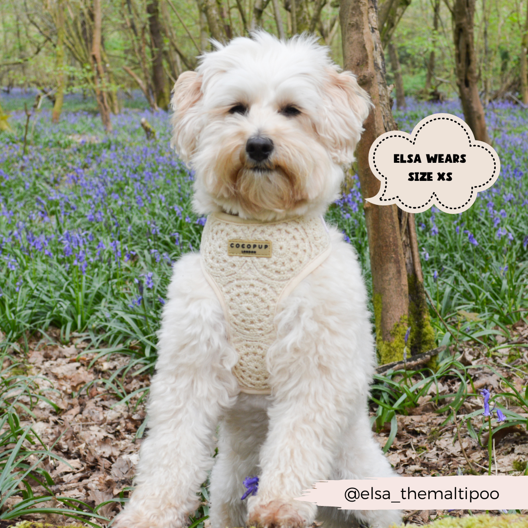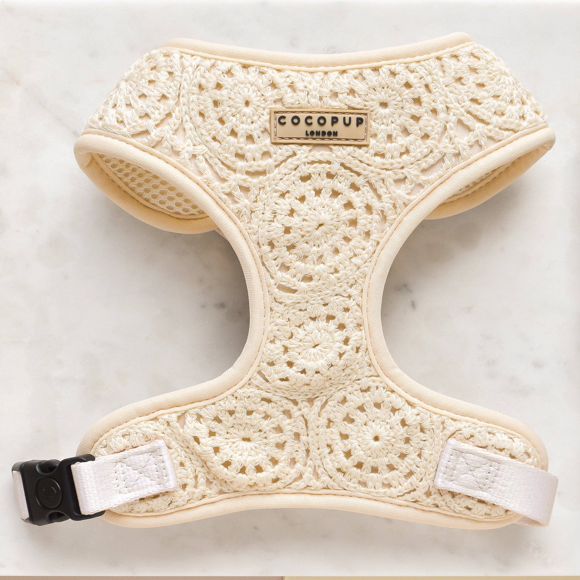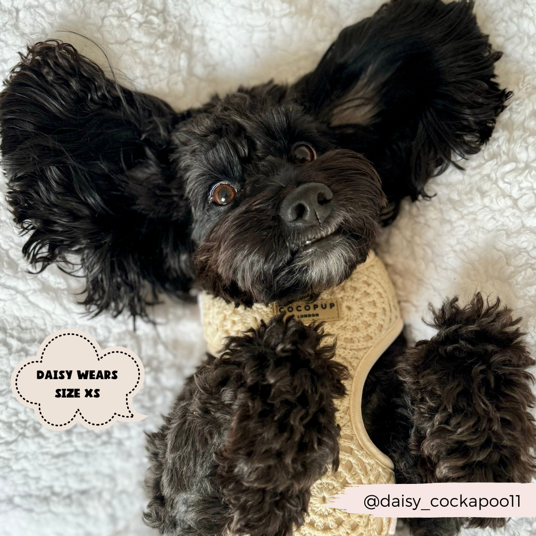 Get ready for a fun and stylish stroll with the Festival Crochet Adjustable Neck Harness! Perfect for dog walks during spring and summer, this harness is made with a chic crochet design that will make your furry friend stand out. Plus, it's adjustable for a comfortable fit. It's a walk in the park! Our Adjustable Neck harnesses provide a comfy and stylish alternative to collars. Slide over your pup's head, adjust at the neck and chest, fasten at the side and you'll be "walkies" ready! * Black D ring for lead attachment * Polyester * Lightweight and comfortable * Fully adjustable chest strap XXS: Neck = 22cm-25cm/ Chest = 30cm-40cm Extra Small: Neck = 29-36cm/ Chest = 35-48cm Small: Neck = 35-43cm/ Chest = 41-54cm Medium: Neck = 39-50cm/ Chest = 46-60cm Large: Neck = 42-55cm/ Chest = 57-80cm This product is part of our aesthetic collection - the material is very delicate **Please note that like all human accessories, dog accessories are subject to wear and tear and it is the responsibility of the o