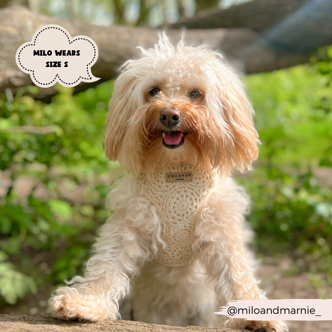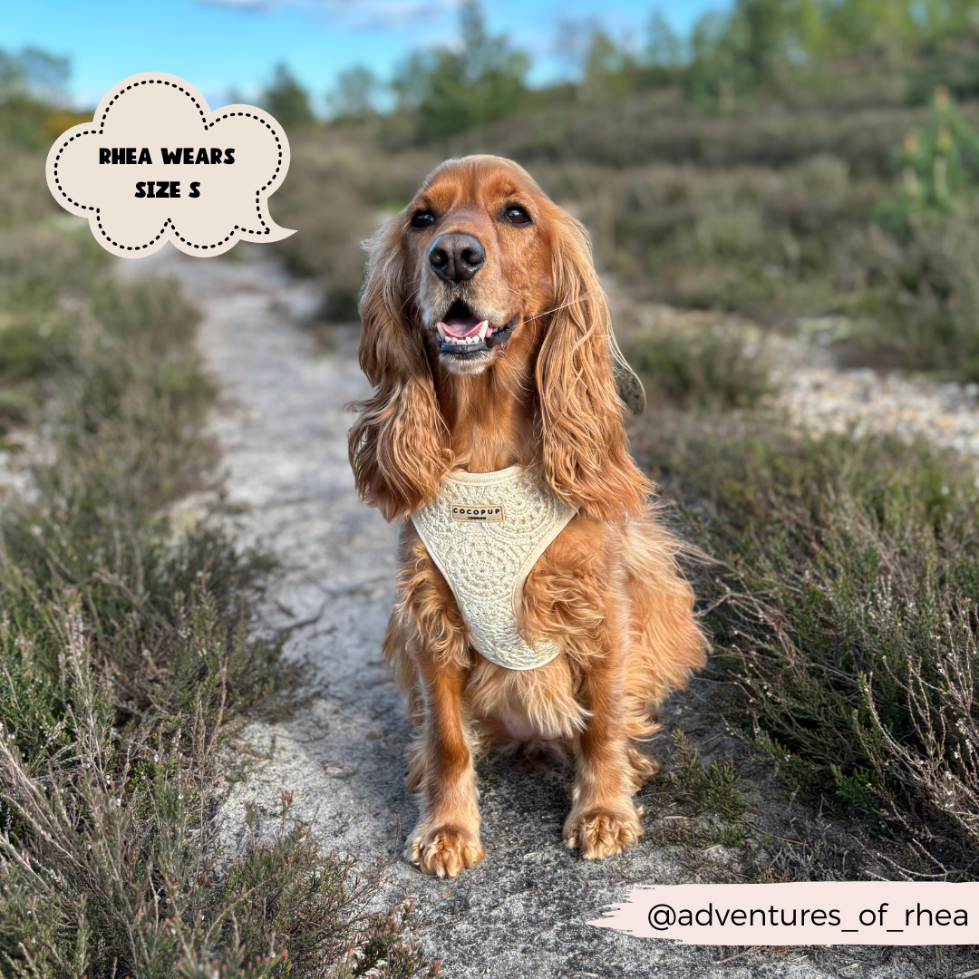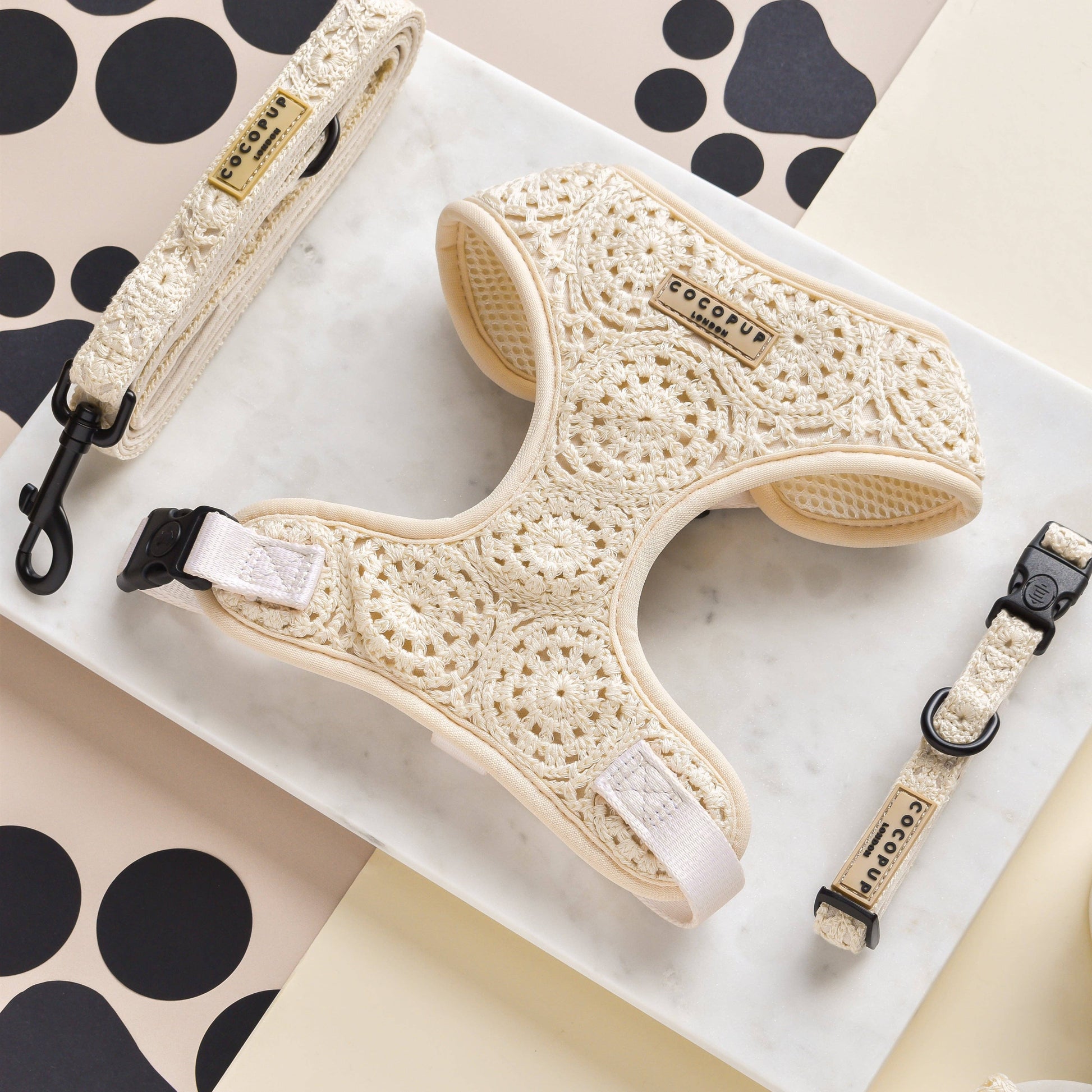 Get ready for a fun and stylish stroll with the Festival Crochet Adjustable Neck Harness! Perfect for dog walks during spring and summer, this harness is made with a chic crochet design that will make your furry friend stand out. Plus, it's adjustable for a comfortable fit. It's a walk in the park! Our Adjustable Neck harnesses provide a comfy and stylish alternative to collars. Slide over your pup's head, adjust at the neck and chest, fasten at the side and you'll be "walkies" ready! * Black D ring for lead attachment * Polyester * Lightweight and comfortable * Fully adjustable chest strap XXS: Neck = 22cm-25cm/ Chest = 30cm-40cm Extra Small: Neck = 29-36cm/ Chest = 35-48cm Small: Neck = 35-43cm/ Chest = 41-54cm Medium: Neck = 39-50cm/ Chest = 46-60cm Large: Neck = 42-55cm/ Chest = 57-80cm This product is part of our aesthetic collection - the material is very delicate **Please note that like all human accessories, dog accessories are subject to wear and tear and it is the responsibility of the o
