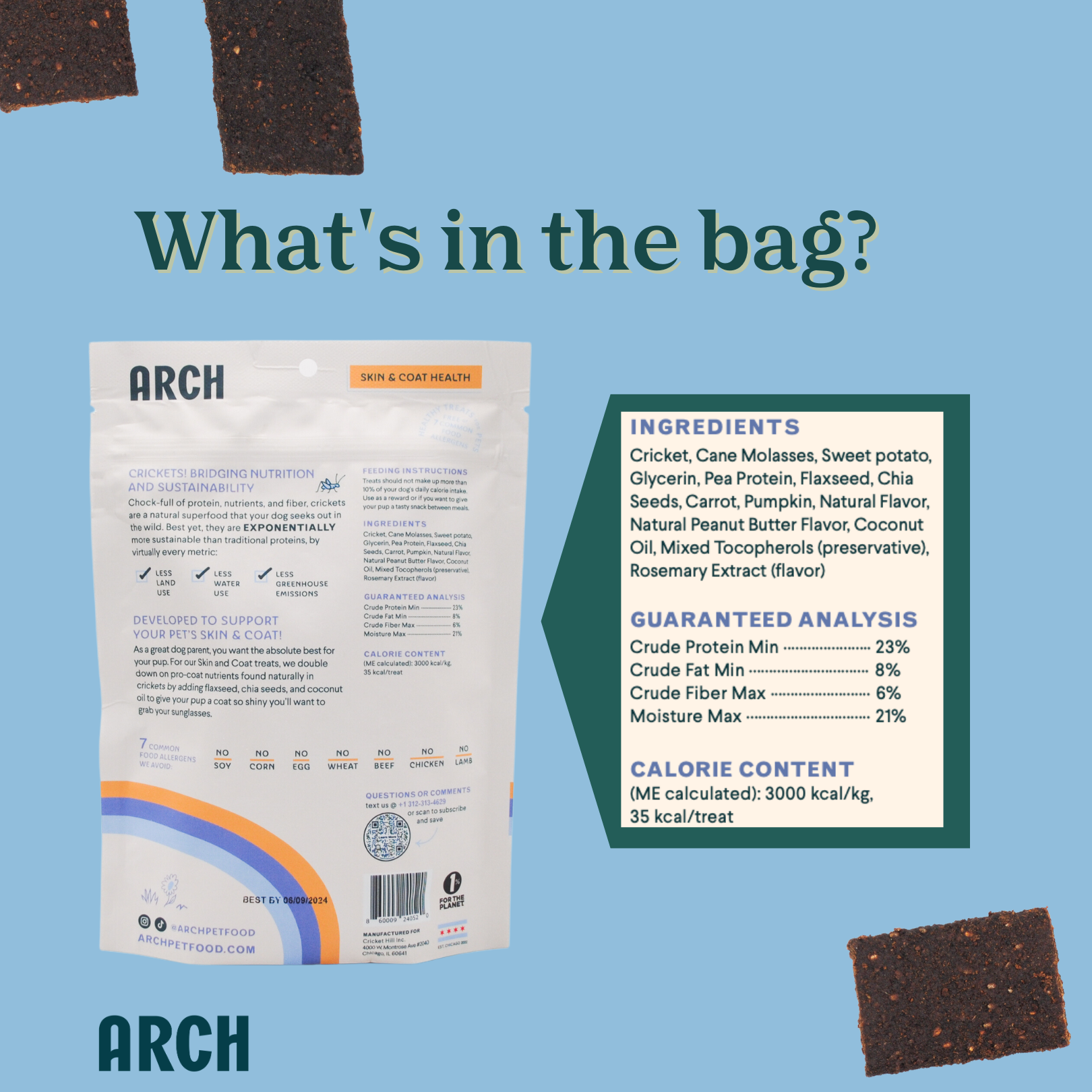 If you're like most pet parents, you want the absolute best for your pup. In addition to focusing on creating recipes that are easy to understand and free of the major allergens for dogs - we make your pet’s health our top priority. For our Skin and Coat treats, we double down on the omega fats found naturally in crickets by adding flaxseed, chia seeds, and coconut oil to give your pup a coat so shiny you’ll want to grab your sunglasses.