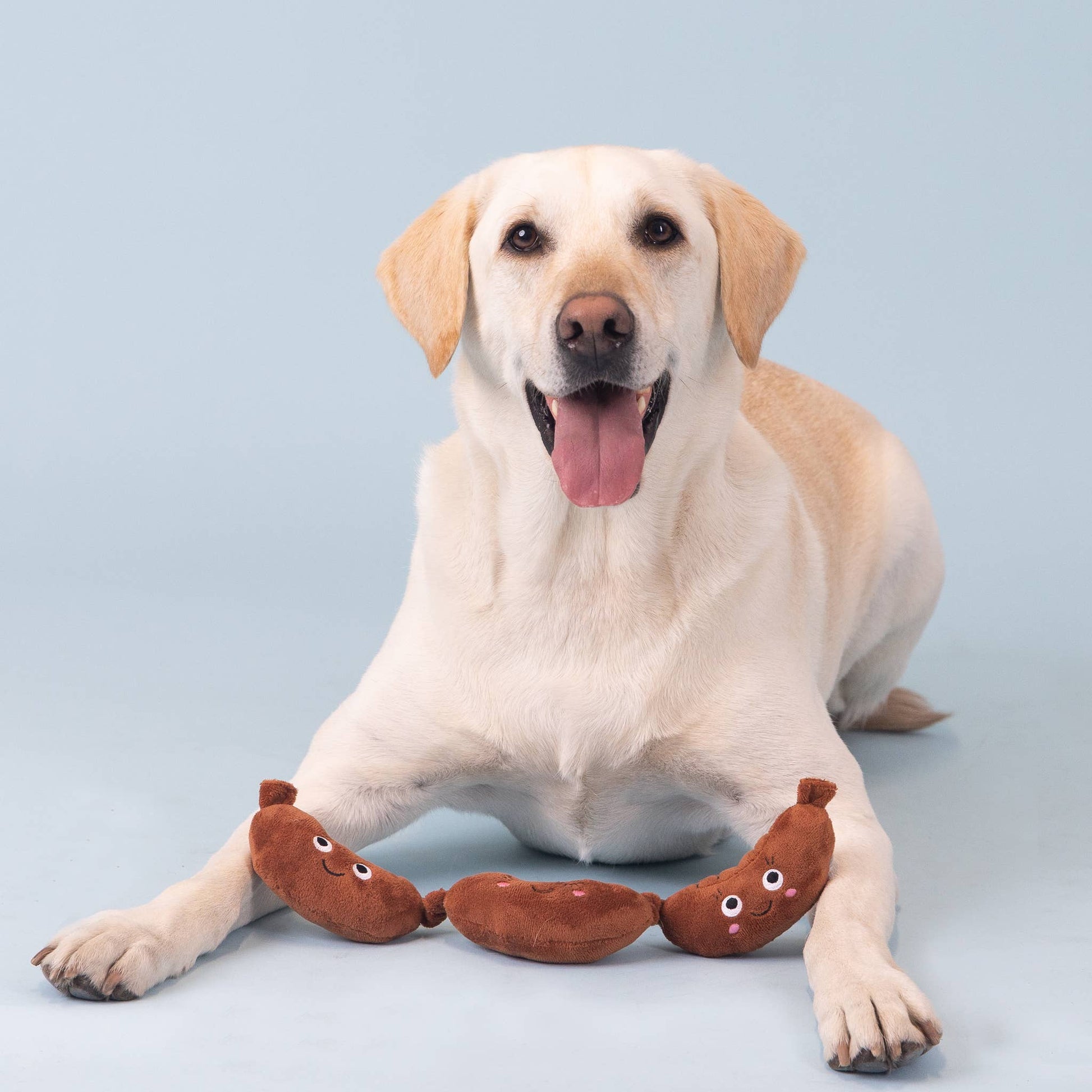 Welcome to Wagsdale! “Making Ends Meat” is perfect for playtime, anytime. Made with a super loud squeaker in each sausage, this toy was designed with interactive play in mind. Whether you squeak, crinkle or toss it, your pup won’t be able to resist this drool worthy toy. Great for all sized dogs and not intended for aggressive chewers.