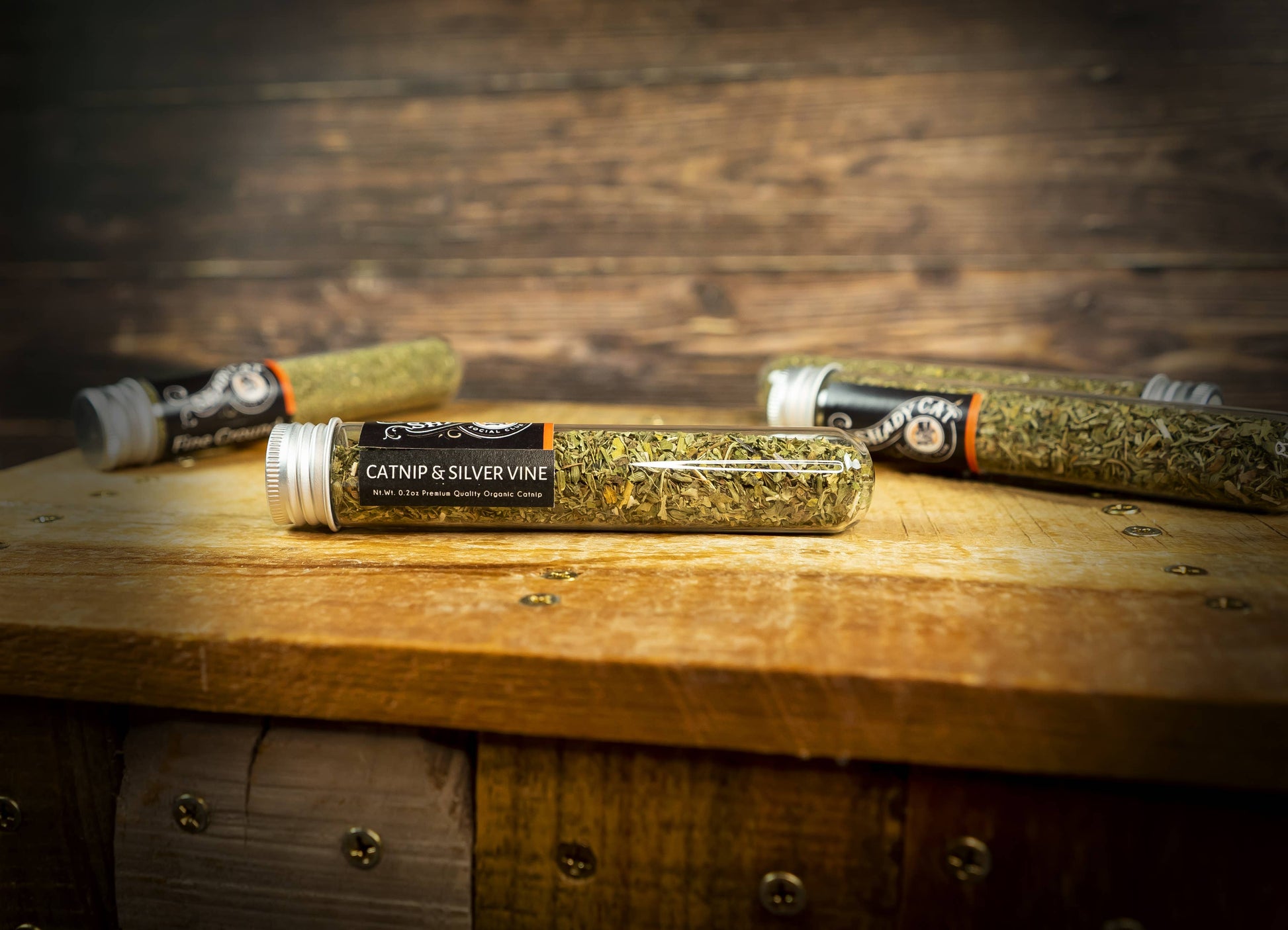 Catnip & Silver vine - an amazing and power packed blend of our original Leaf & Flower catnip with organic ground Silver vine. A double whammy! If the catnip does not immediately tickle your cats fancy, the Silver vine will definitely do the trick. All four of Shady Cat's catnip blends are offered in a 1.25 oz. bag and .20 oz. glass tubes! Take your pick! You can't go wrong! How to use our catnip: we recommend that you keep your catnip stored in it's airtight bag. All your cat needs is a pinch. For maximum potency, rub the catnip between your fingers to release all the oils stored in the catnip. This blend is also great for multi cat households as not every cat is born with the gland that makes them respond to catnip! They should still respond to the silver vine in the blend though. I always let customers know that there is 5x the catnip in the black bag for just twice the price, so if they know their cat(s) love the product, go for the bag! Tubes are great for trying us out!
