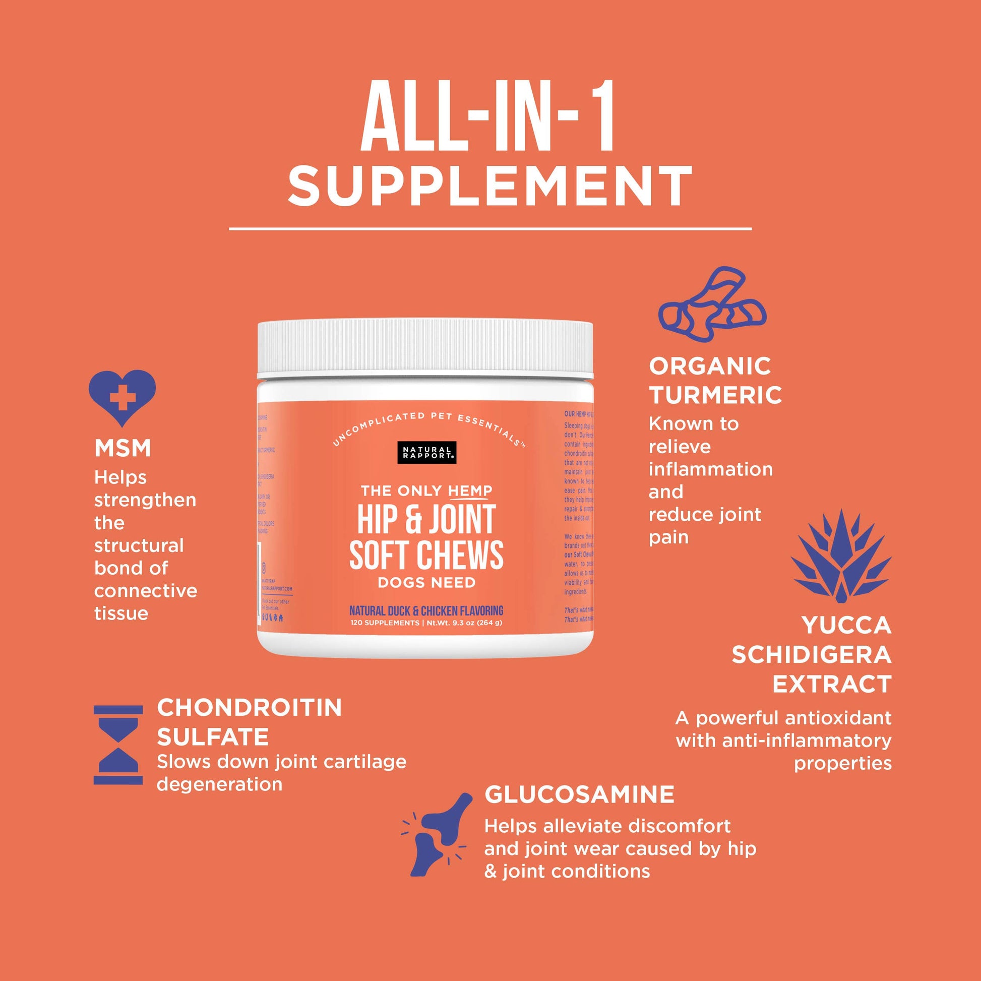 Sleeping dogs lie, but we all know hips don’t. Our Hip & Joint Soft Chews contain ingredients like glucosamine, chondroitin sulfate, turmeric, and MSM that are not only shown to support & maintain joint health; but are also known to help reduce inflammation & ease pain. Most importantly though, they help improve your pup’s ability to repair & strengthen joint tissues from the inside out. We know there are other supplement brands out there but what truly makes our Soft Chews different is this: Our cold pressed process does not use any heat or water, which allows us to maintain the full integrity, viability and flavor profile of all the ingredients. That’s what makes us better. That’s what makes us Natural Rapport. **International Retailers - Please note this product contains animal byproduct which we cannot export to countries outside of the United States.